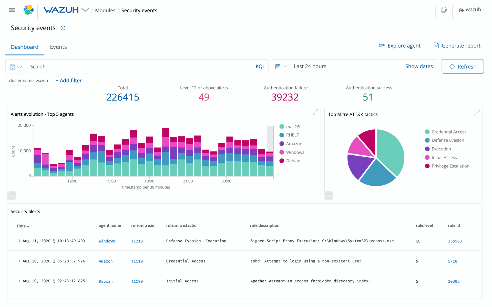 La solution Wazuh se compose d'un agent de sécurité des terminaux, déployé sur les systèmes surveillés, et d'un serveur de gestion, qui collecte et analyse les données recueillies par les agents. En outre, Wazuh a été entièrement intégré à Elastic Stack, fournissant un moteur de recherche et un outil de visualisation de données qui permet aux utilisateurs de naviguer dans leurs alertes de sécurité.